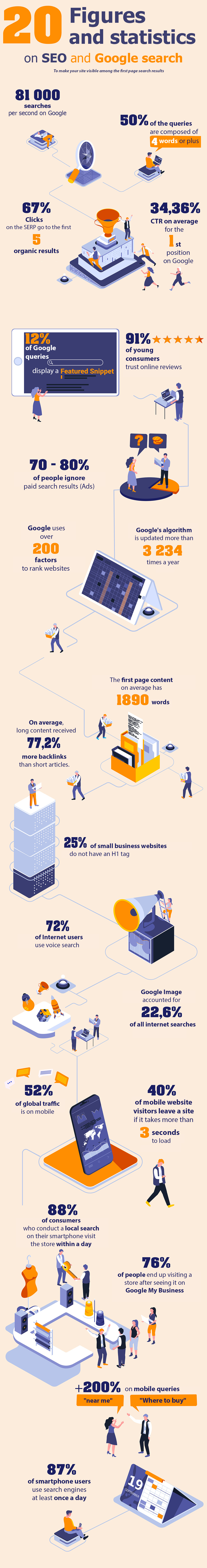 To help you optimize your SEO strategy, we present 20 SEO statistics and Google search results along with relevant infographics so you can make the most of them for your website.